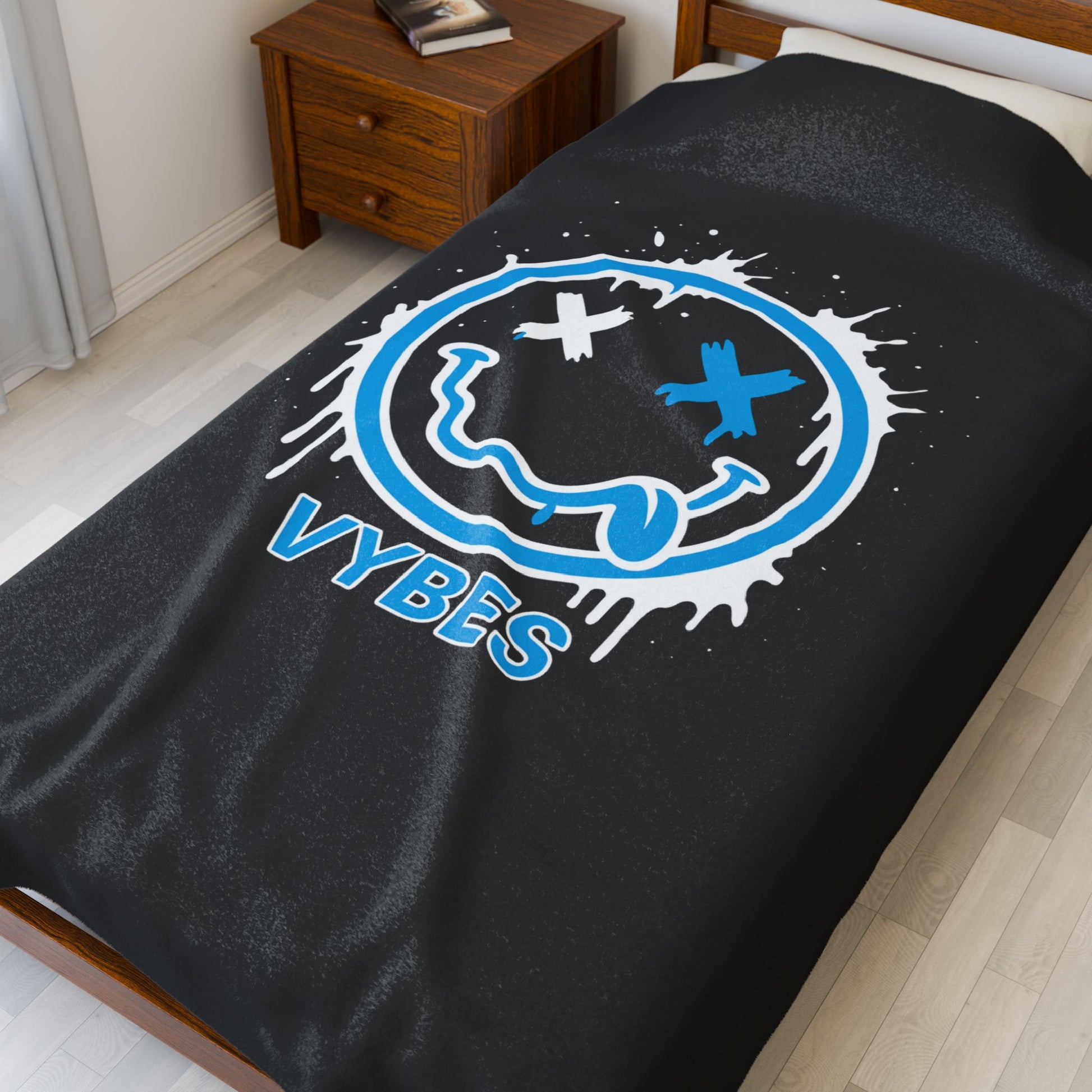 Sink into a low-lit room, turn up the playlist, and wrap yourself in this velveteen plush blanket—where street-art edge meets late-night comfort. The bold, graffiti-style smiley with crossed-out eyes and paint splatters reads like a mood, not a logo. It sits bright and detailed against the deep black nap, offering a tactile, cozy layer that still feels city-cool. Drape it over a couch, toss it across a dorm bed, or pull it around your shoulders during a hoodie-less show night. Lightweight but substantial, it follows the rhythm of your nights: loud graphics, soft touch, and built to last through repeated spins in the wash. This is for people who collect memories in playlists and late rides — a blanket that speaks the same language as your vibe.